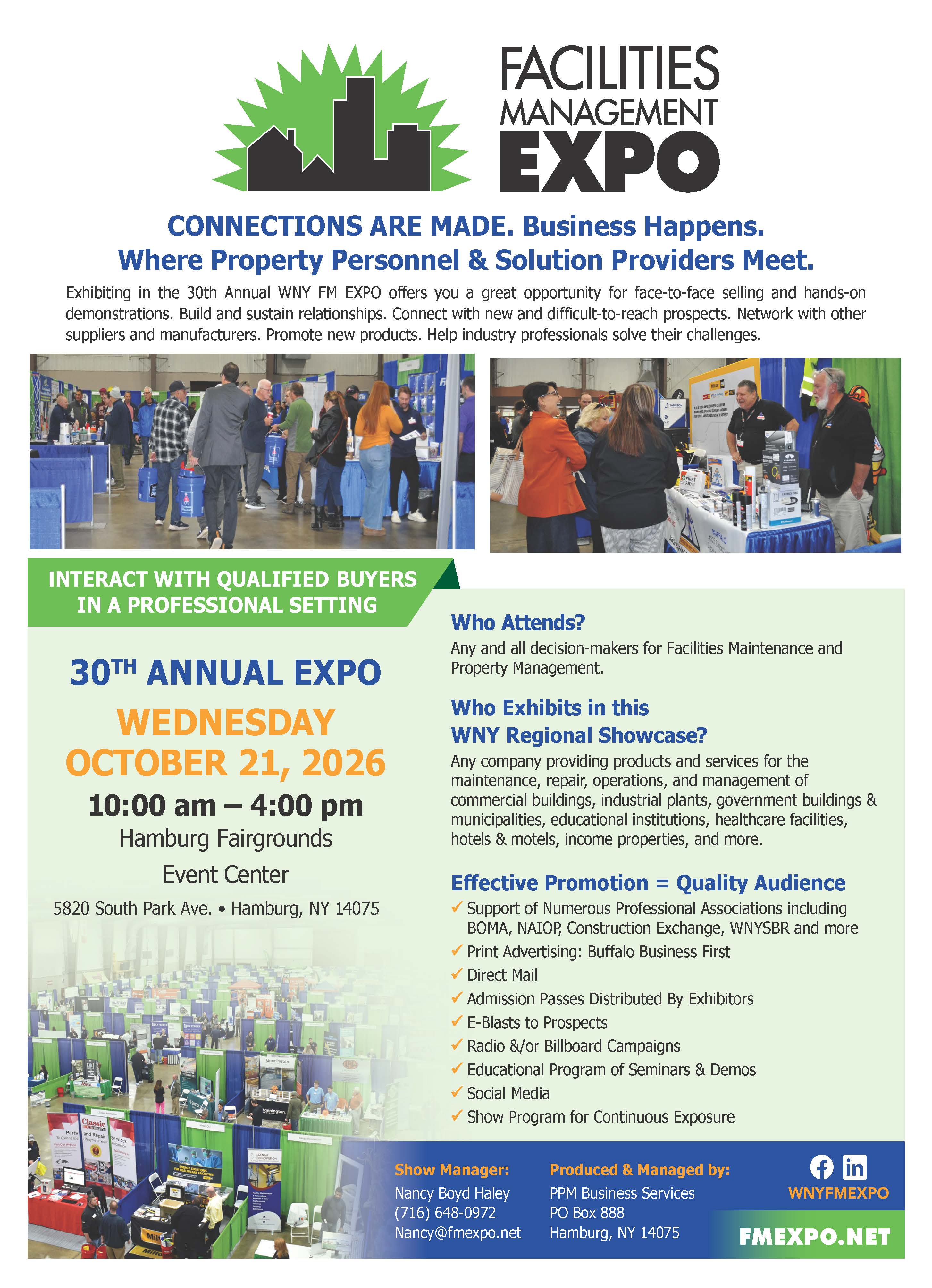 The WNY Facilities Management Expo connects exhibitors with quality decision-makers, including facility engineers, building owners and superintendents, property managers, purchasing agents, maintenance personnel, realtors, developers, contractors, architects, and managerial staff members. This trade show is an excellent way to reach target audiences, with face-to-face interaction with your potential new customers! The FM Expo is regional in scope...no expensive and time-consuming air travel.